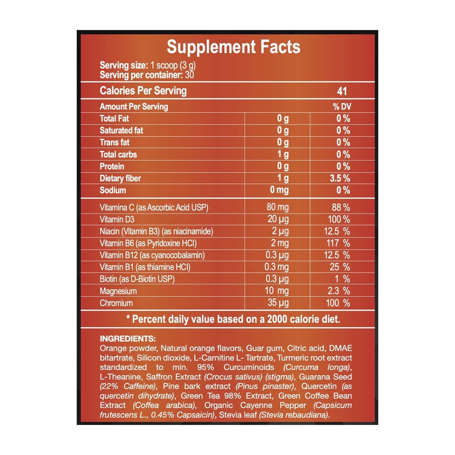Polvo de naranja (citrus sinensis), sabor naranja, goma guar, ácido cítrico, dmae dimetilaminoetanol, cafeína natural proveniente de extracto de granos de café verde, vitamina c (ácido asc&oacórbico), óxido de silicio, l-carnitina tartrato (levocarnitina), extracto de raíz de cúrcuma al 95% curcuminoides (curcuma longa l.), vitamina d3 (colecalciferol), vitamina b3 (niacina), quercetina, l-theanina, extracto de té verde (camellia sinensis), extracto de guaraná (paullinia cupana), extracto de granos de café verde (coffea arabica), extracto de corteza de pino (pinus pinaster), extracto de azafrán (crocus sativus l.), extracto de estevia (stevia rebaudiana), citrato de magnesio, picolinato de cromo, extracto de pimienta cayena (capsicum annuum), vitamina b6 (piridoxina), vitamina b7 (biotina), vitamina b12 (cobalamina), vitamina b1 (tiamina).